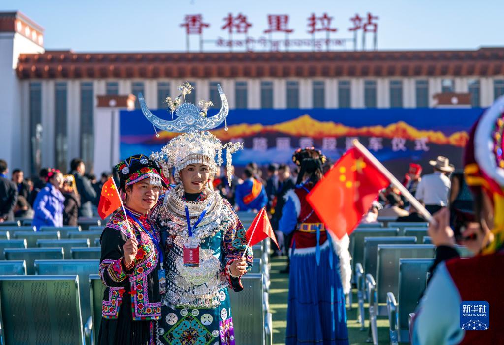 11月26日,參加麗香鐵路開通儀式的少數民族代表在開通儀式上拍照留念。