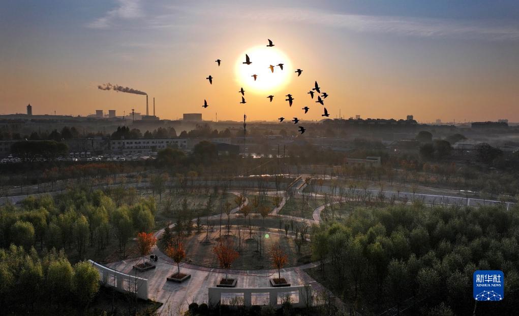 11月26日,一群鴿子在唐山市古冶區石榴河濕地公園上空飛舞(無人機照片)。