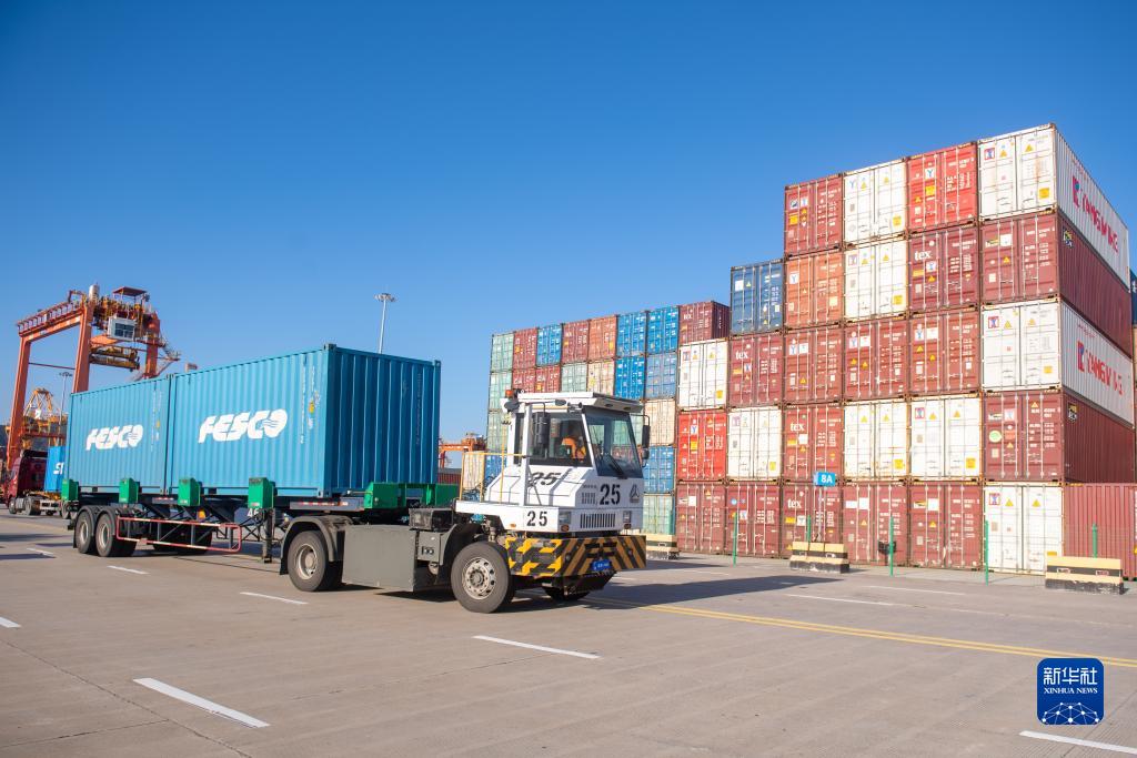 11月22日,裝載集裝箱的卡車行駛在溫州港狀元岙集裝箱碼頭內。
