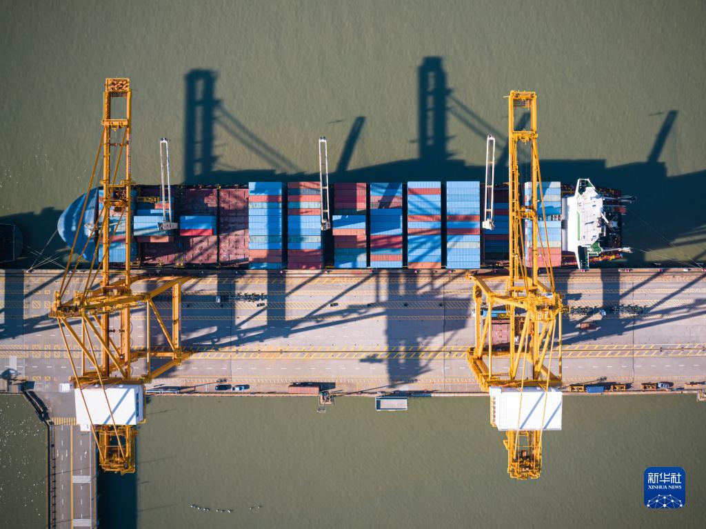 11月22日,貨輪??吭跍刂莞蹱钤b箱碼頭卸載集裝箱(無人機照片)。