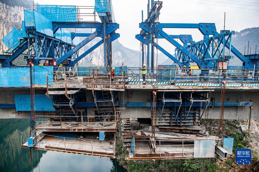 11月26日,在位于重慶市酉陽土家族苗族自治縣龔灘鎮(zhèn)境內(nèi)的阿蓬江大橋施工建設(shè)現(xiàn)場,工人正在現(xiàn)場作業(yè)。