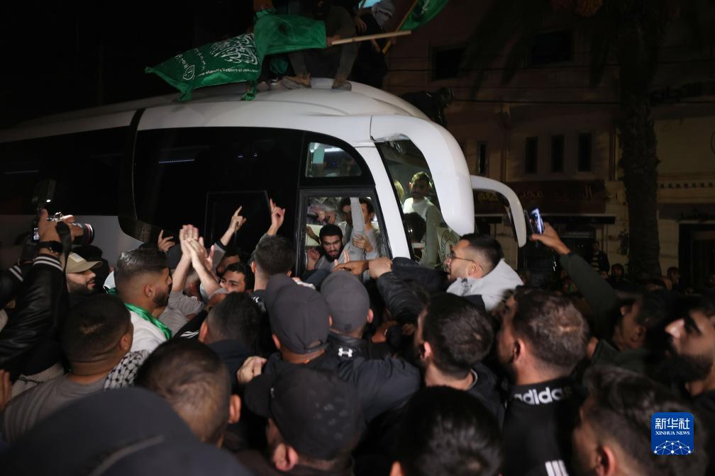 11月26日,載有獲釋巴勒斯坦被關(guān)押人員的大巴抵達(dá)約旦河西岸城市比拉。