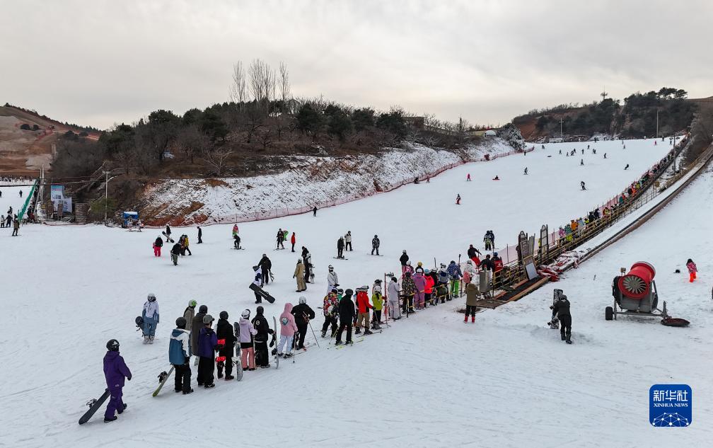 11月26日,滑雪愛好者在位于天津市薊州區的薊洲國際滑雪場內排隊體驗雪上運動(無人機照片)。