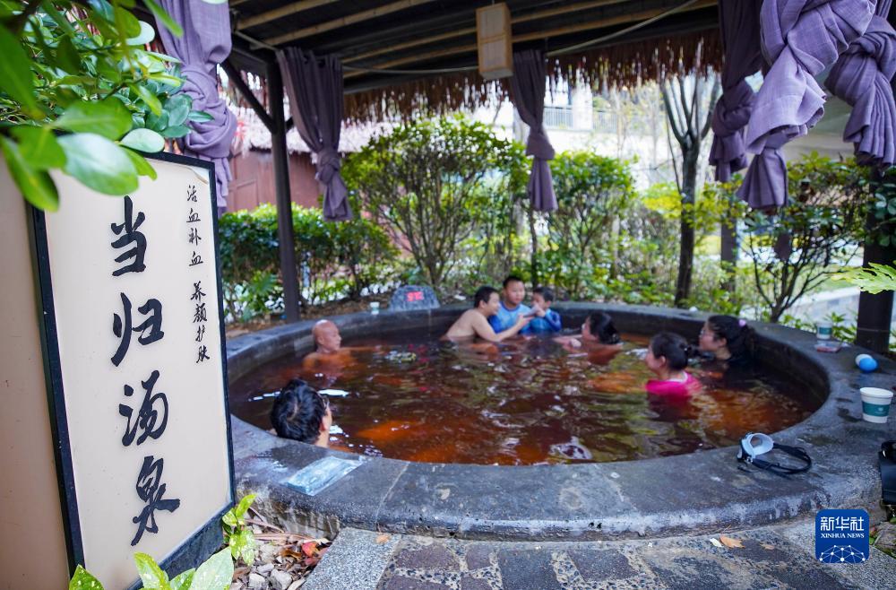 11月25日,游客在貴州省丹寨縣萬達小鎮泡溫泉。