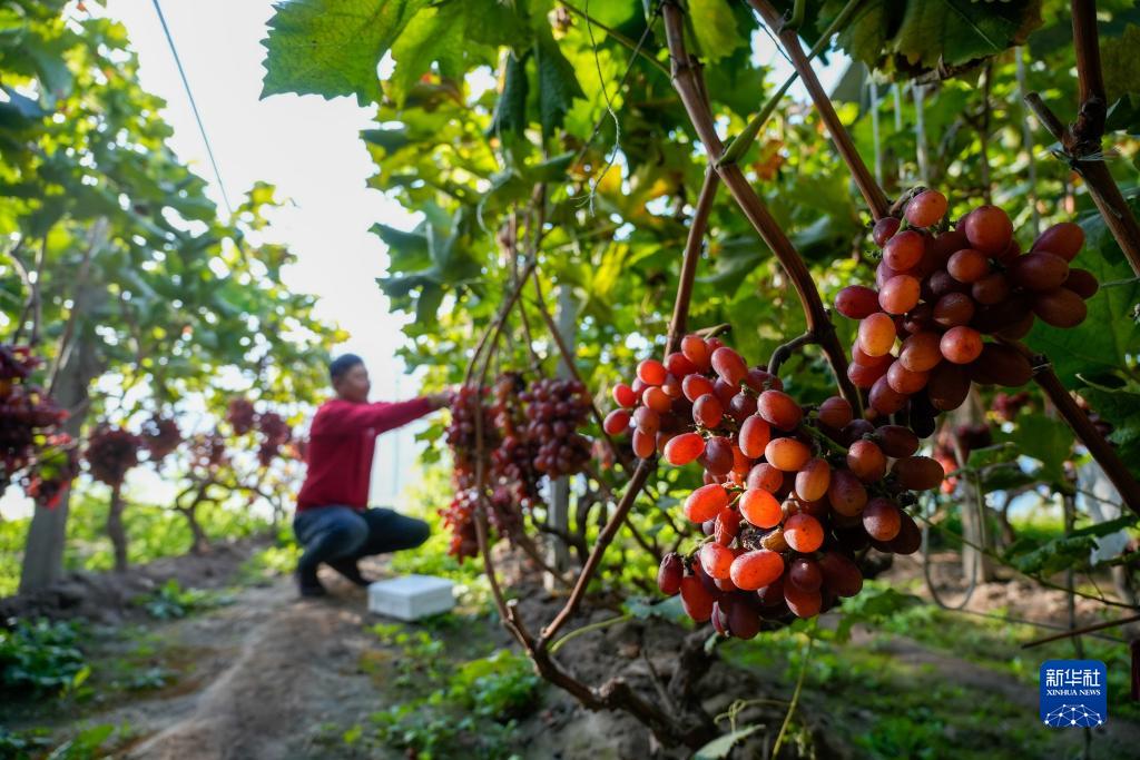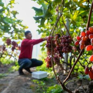 11月26日,游客在河北省灤州市茨榆坨鎮蘆葦莊村一處大棚內采摘葡萄。