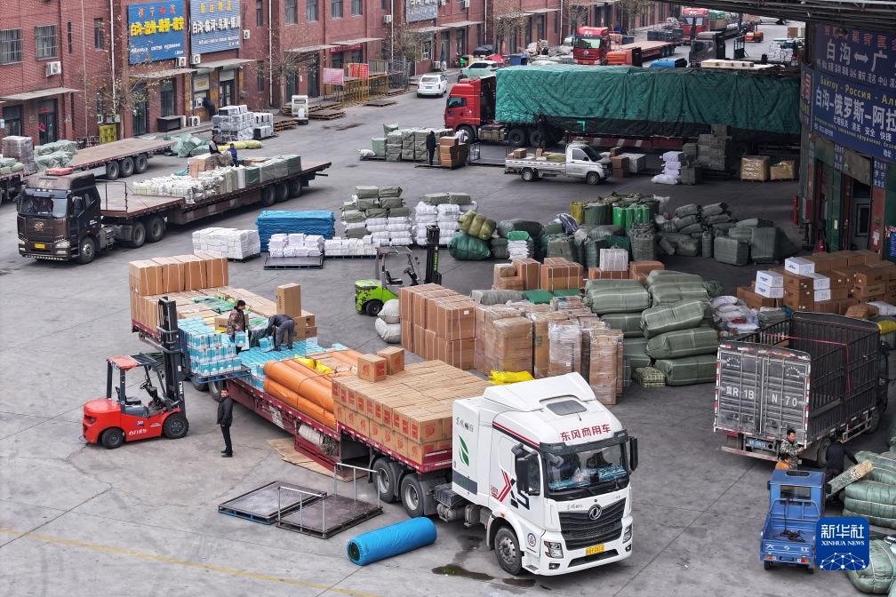 11月26日,在白溝新城東物流園區(qū),貨車在裝卸貨物(無人機(jī)照片)。
