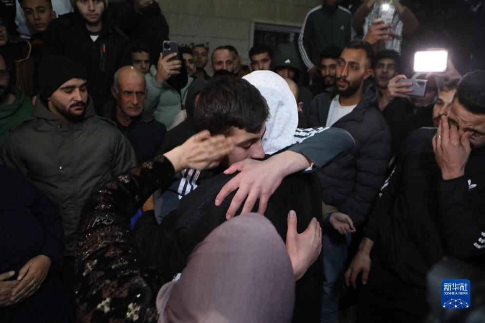 11月27日,在約旦河西岸城市希伯倫北部的一座村莊,一名獲釋的巴勒斯坦人與親人團聚。