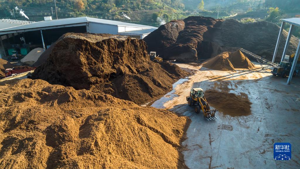 11月27日拍攝的道真仡佬族苗族自治縣尹珍街道一處杏鮑菇種植基地的菌棒原料加工場(無人機照片)。