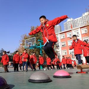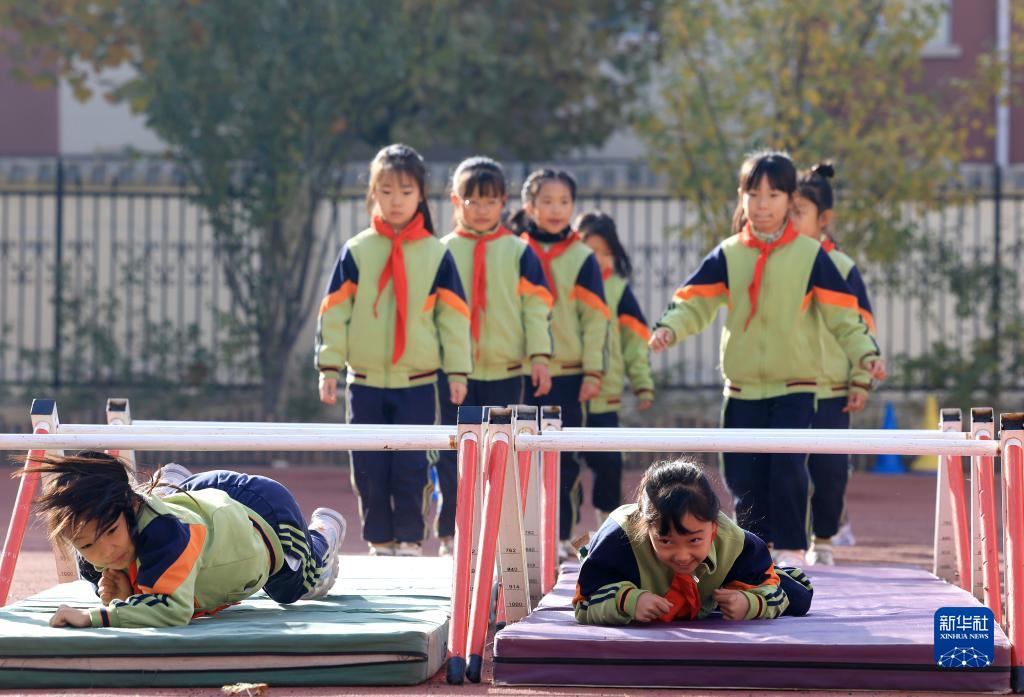 11月27日,河北省石家莊市仁華小學學生在大課間進行“匍匐前進”游戲。