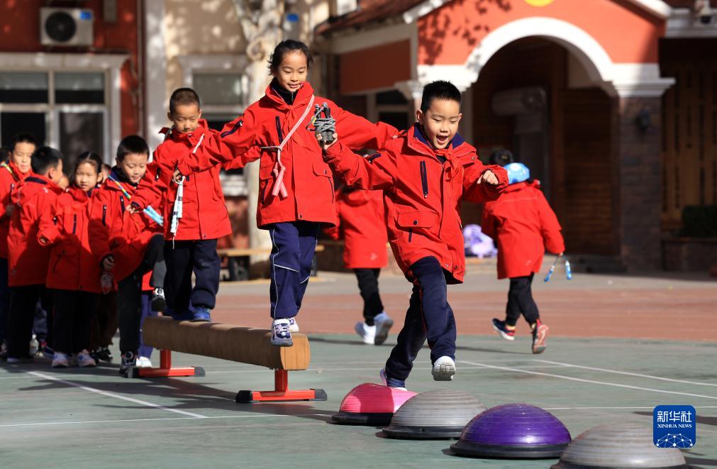 11月27日,河北省石家莊市翟營大街小學學生在大課間進行“平衡球跳躍”游戲。