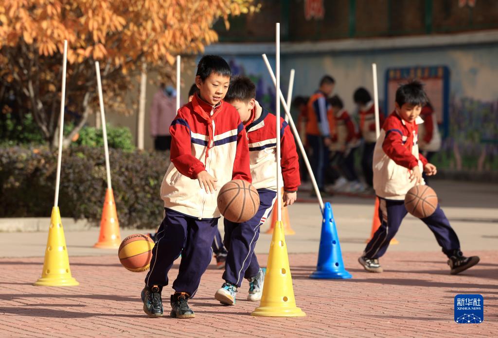 11月27日,河北省石家莊市仁華小學(xué)學(xué)生利用大課間進(jìn)行籃球繞樁練習(xí)。