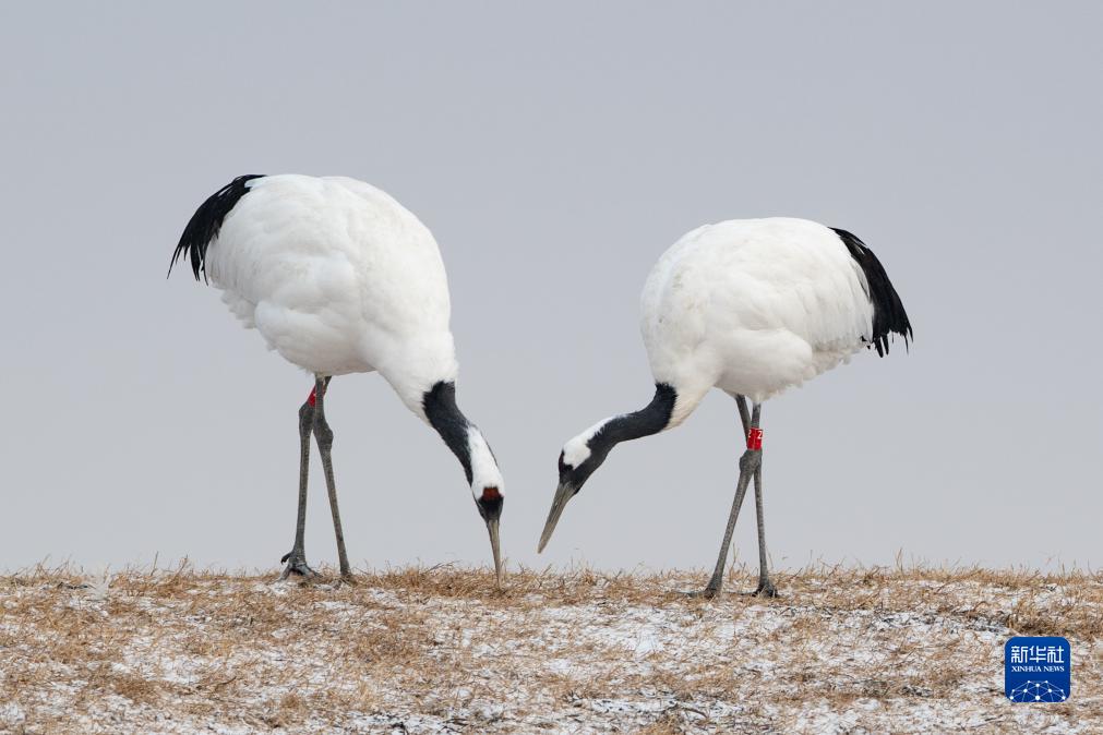 11月27日,在黑龍江扎龍國家級自然保護區,丹頂鶴在雪中覓食。