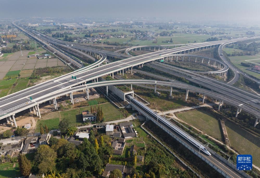 11月28日,首發列車C6008次列車行駛在川青鐵路上,該段與成萬高速并行、與成都都市圈環線高速交會(無人機照片)。