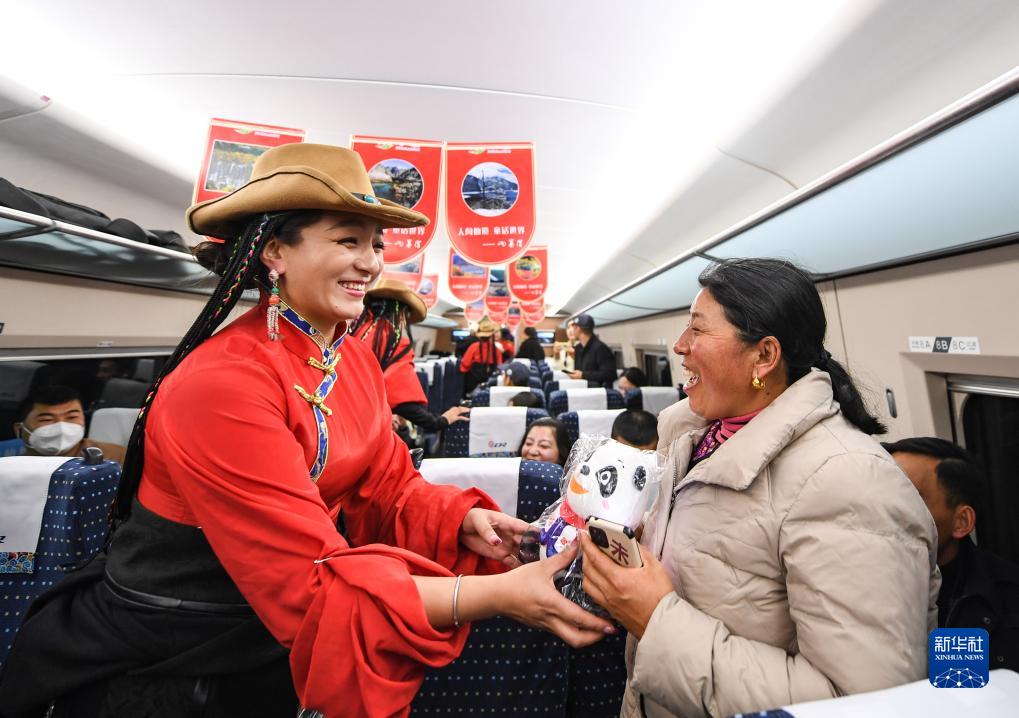 11月28日,在C6008次首發(fā)列車上,來自阿壩州民族歌舞團的演員給乘客贈送紀(jì)念品。