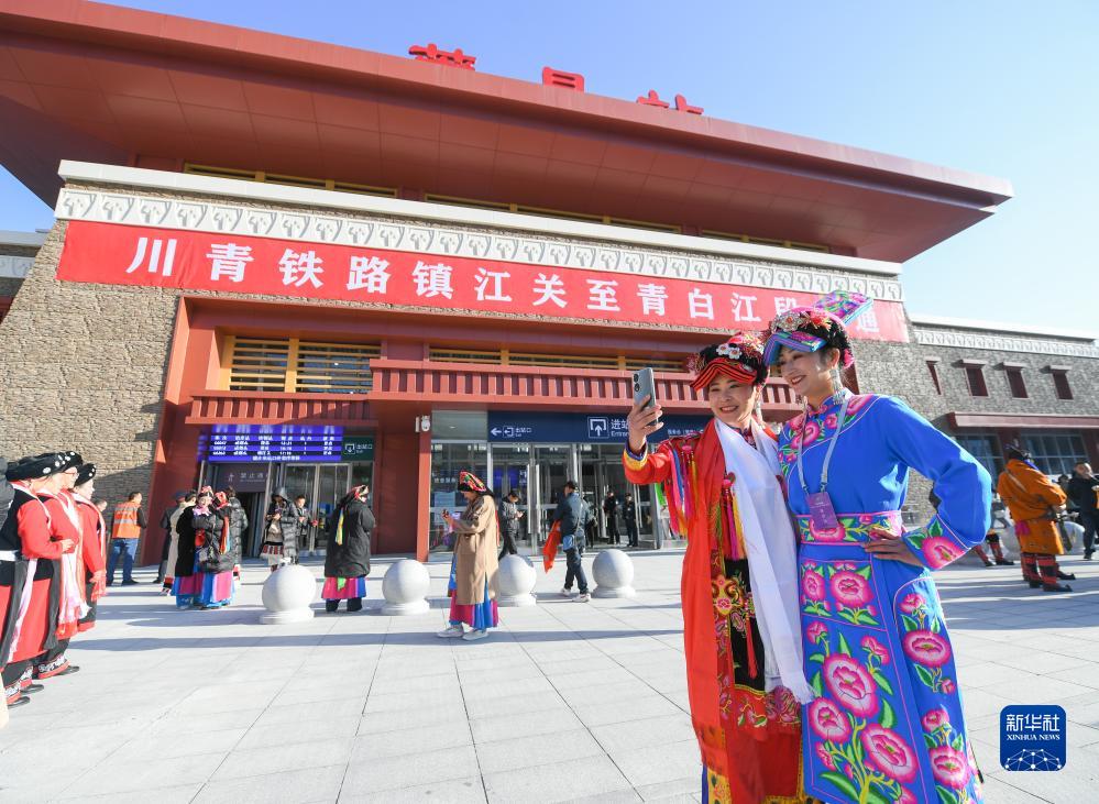 11月28日,在川青鐵路茂縣站,當地各族群眾在站前廣場慶祝鐵路開通運營。
