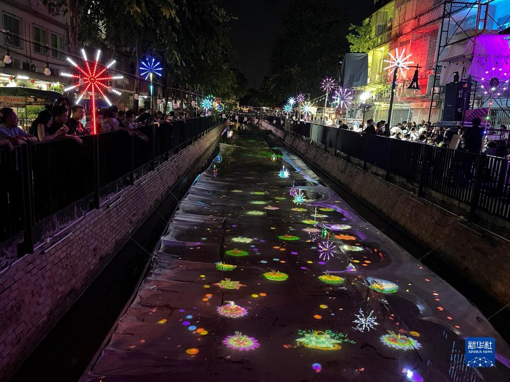 11月27日,色彩斑瀾的數(shù)字水燈投影到曼谷老城區(qū)翁昂運(yùn)河上。