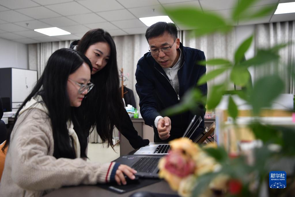 甘肅簡牘博物館整理研究部主任肖從禮(右一)和同事交流簡牘數字化工作(10月25日攝)。新華社記者 陳斌 攝