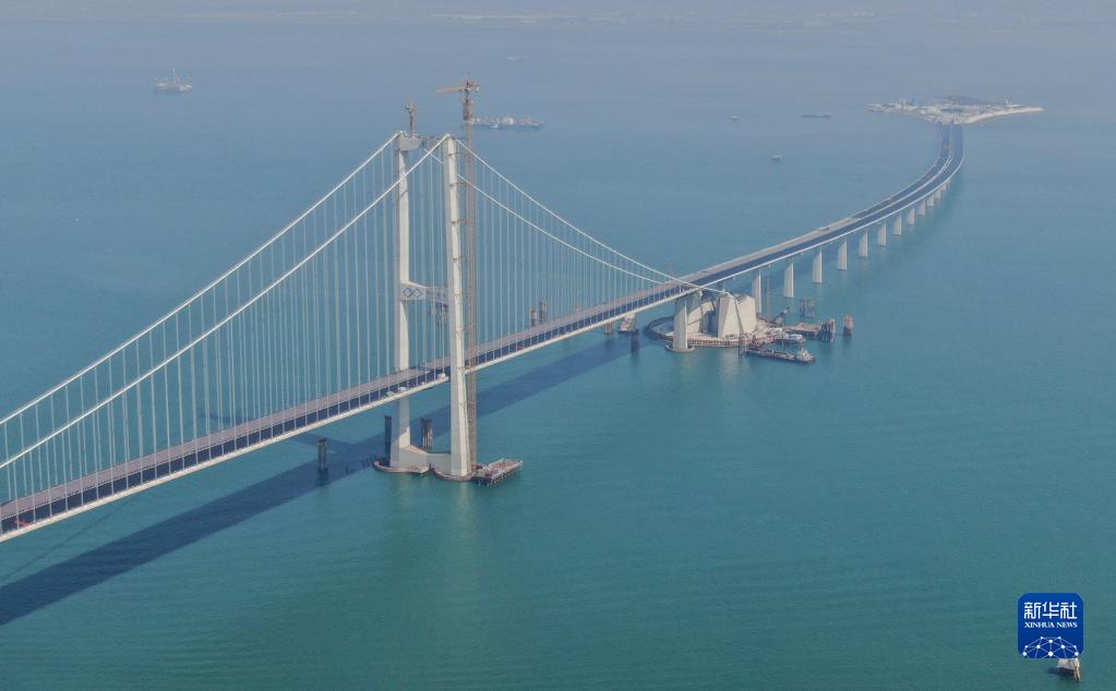 這是11月28日拍攝的深中通道伶仃洋大橋東塔及西人工島(無人機照片)。