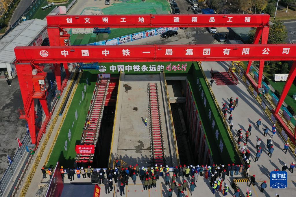 11月28日,在杭州至德清市域鐵路德清高鐵站鋪軌基地,龍門吊將25米軌排吊運至鋪設位置(無人機照片)。