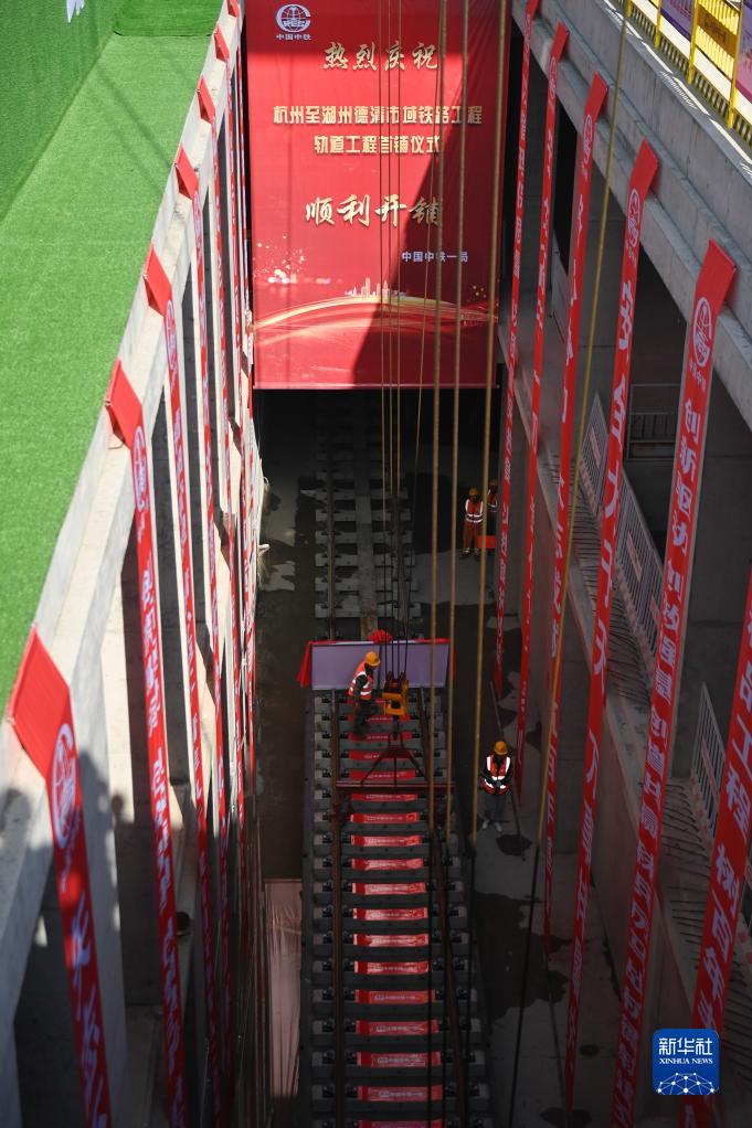11月28日拍攝的杭州至德清市域鐵路鋪軌作業(yè)現(xiàn)場。