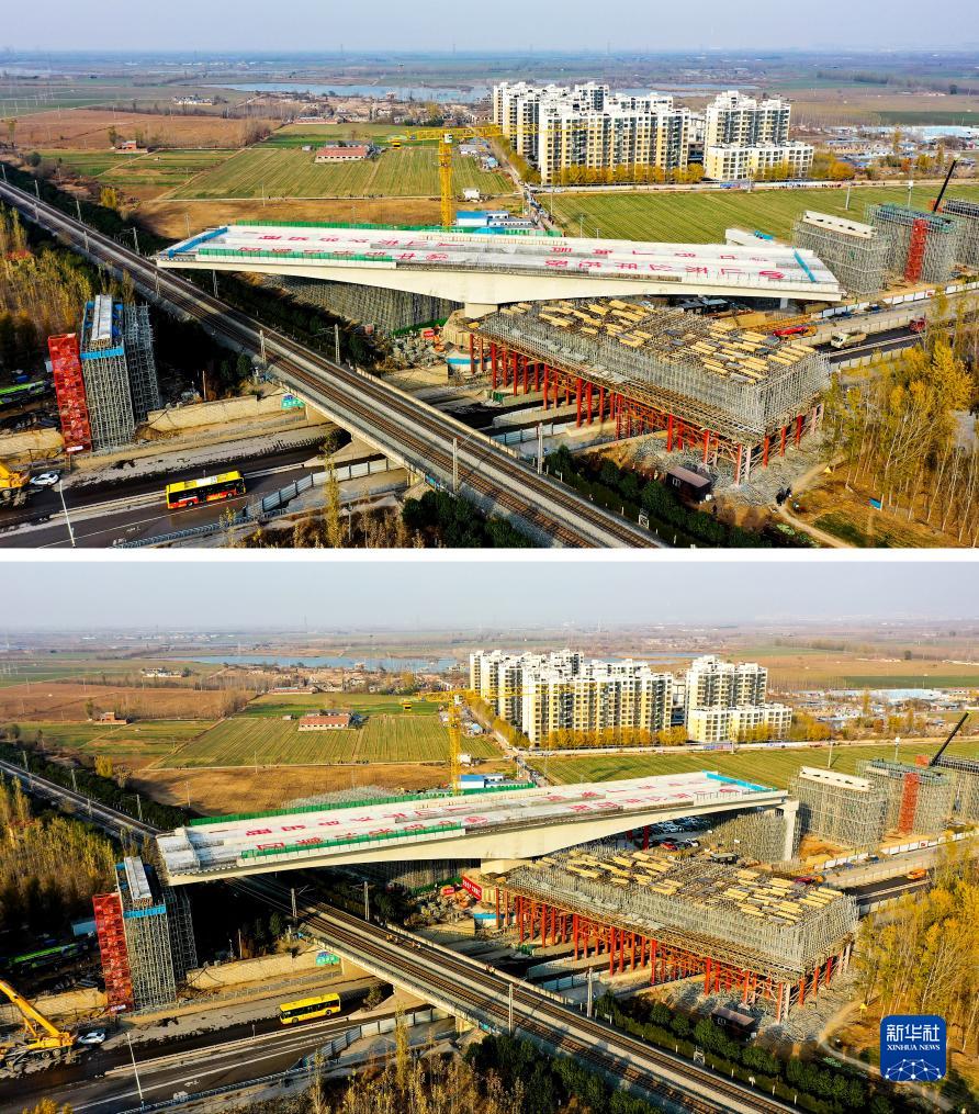 這是一張拼版照片。上圖為濟(寧)曲(阜)快速路上跨京滬鐵路立交橋連續梁轉體作業前的畫面;下圖為濟(寧)曲(阜)快速路上跨京滬鐵路立交橋連續梁成功轉體后的畫面(11月28日攝,無人機照片)。