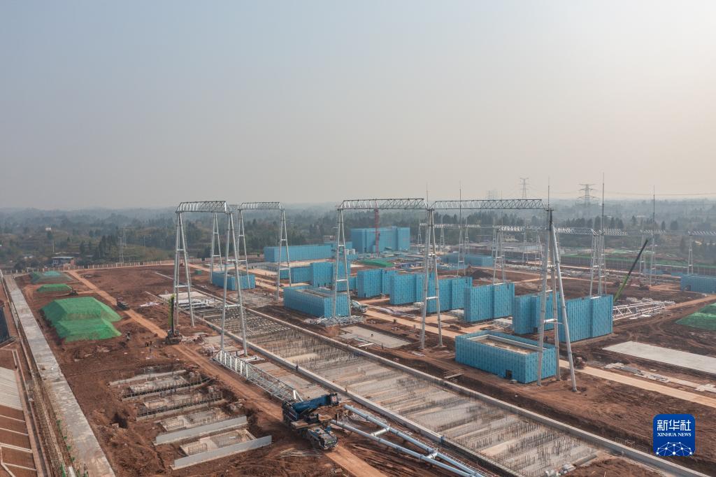 這是11月28日在重慶市銅梁區少云鎮拍攝的銅梁1000千伏變電站構架吊裝作業現場(無人機照片)。