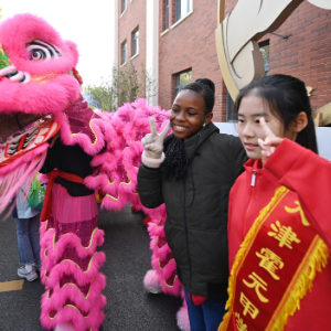 10月25日,“汉语桥”选手在天津霍元甲学校的操场上学习舞龙。