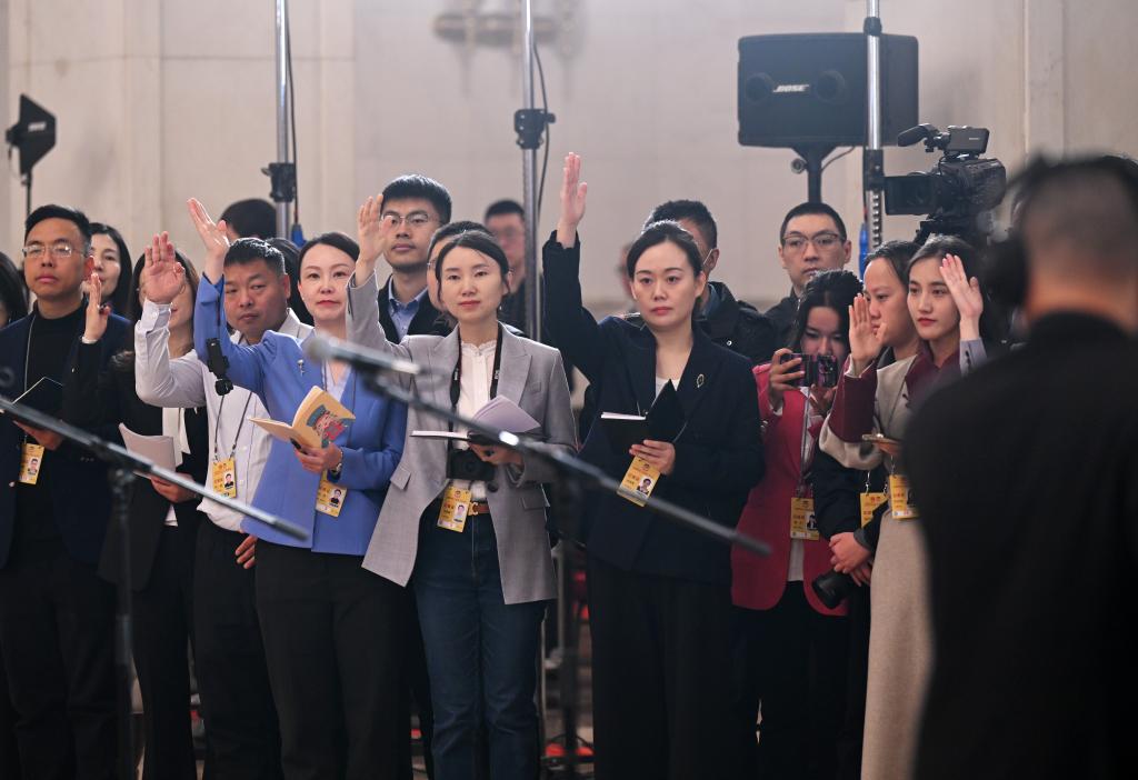 3月10日,全国政协十四届三次会议第三场“委员通道”集体采访活动在北京人民大会堂举行。这是接受采访的全国政协委员入场。