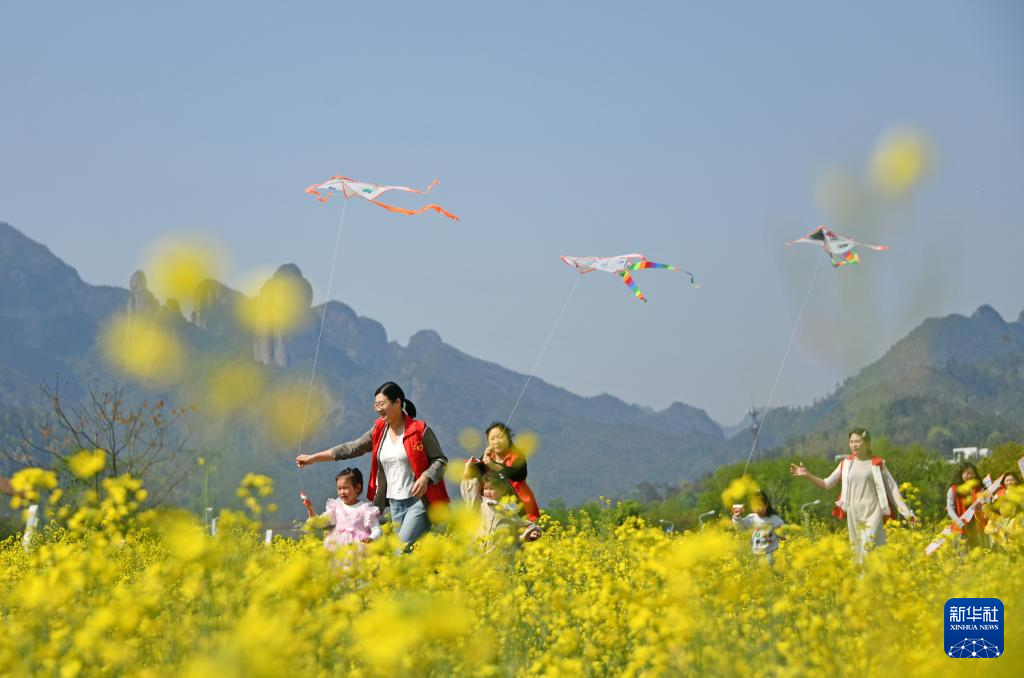 4月7日,浙江省台州市仙居县白塔镇第一幼儿园老师带领小朋友在油菜花海间放飞风筝。