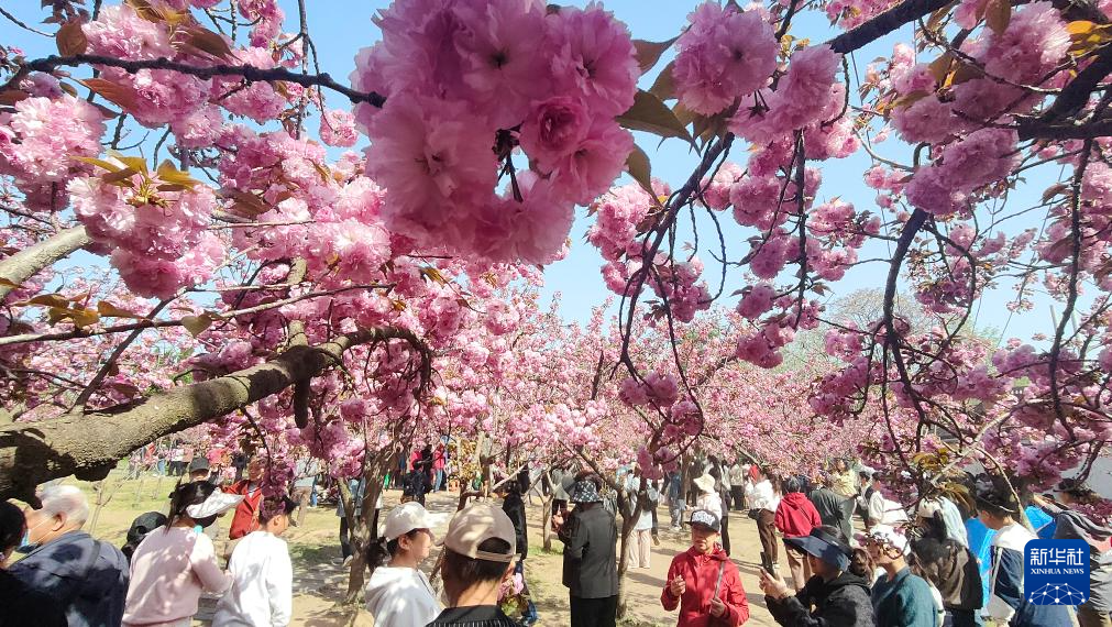 4月8日,游客在河北省遵化市南山常乐谷景区踏青赏花。