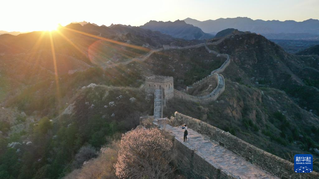 这是4月8日在河北省承德市滦平县拍摄的金山岭长城春色(无人机照片)。