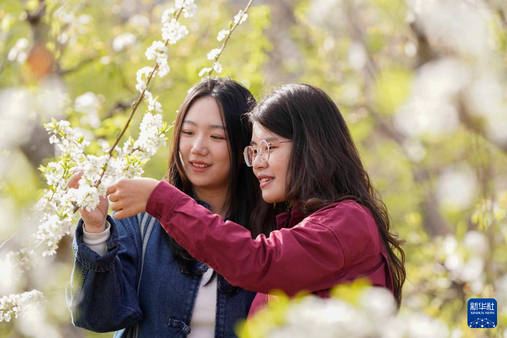 4月8日,人们在河北省遵化市人民公园踏青赏花。