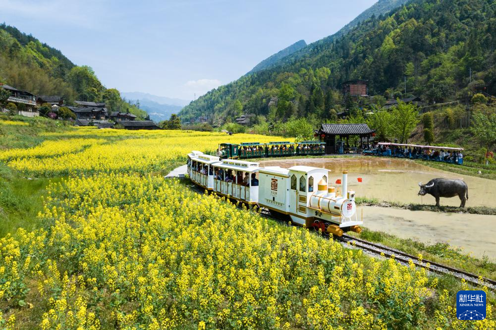 4月8日,游客在湖北省宣恩县彭家寨吊脚楼前乘坐“小火车”赏花游玩(无人机照片)。