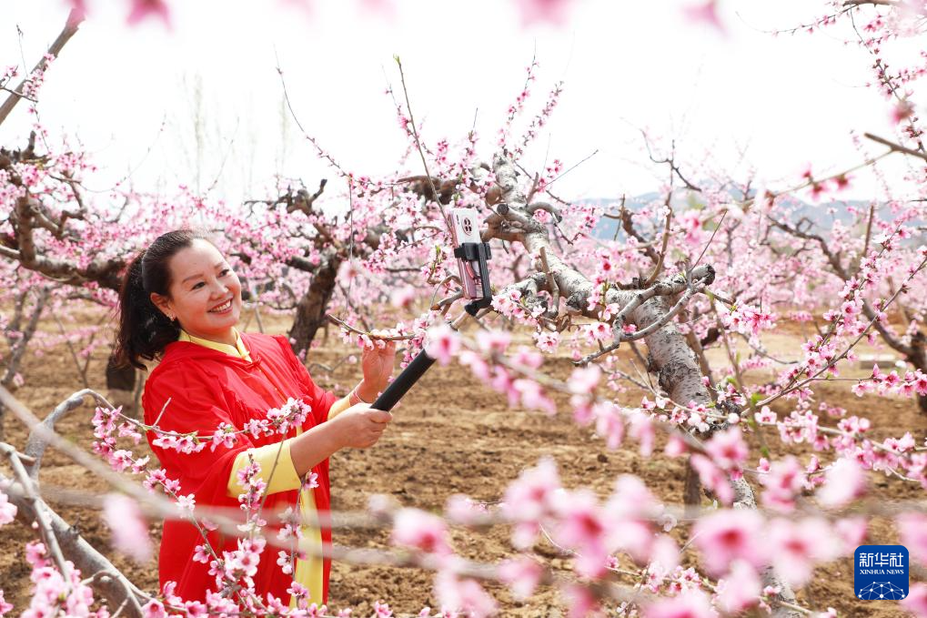 4月8日,游客在河北省唐山市丰润区左家坞镇北夏庄村桃园拍照留念。