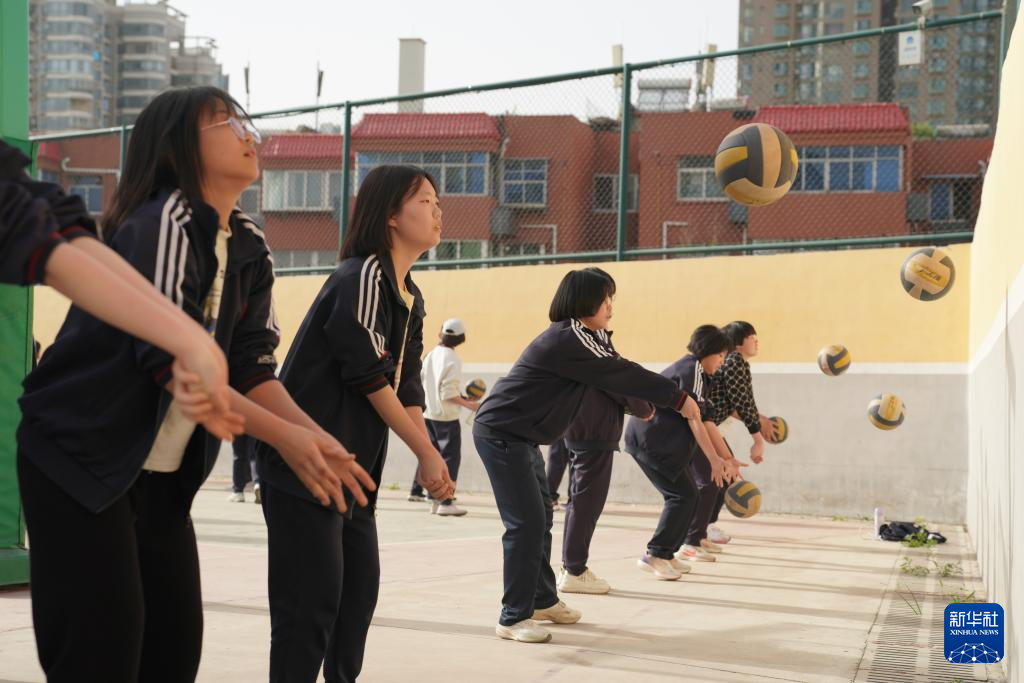 4月8日,西安辅轮中学学生在阳光体育大课间30分钟练习排球。