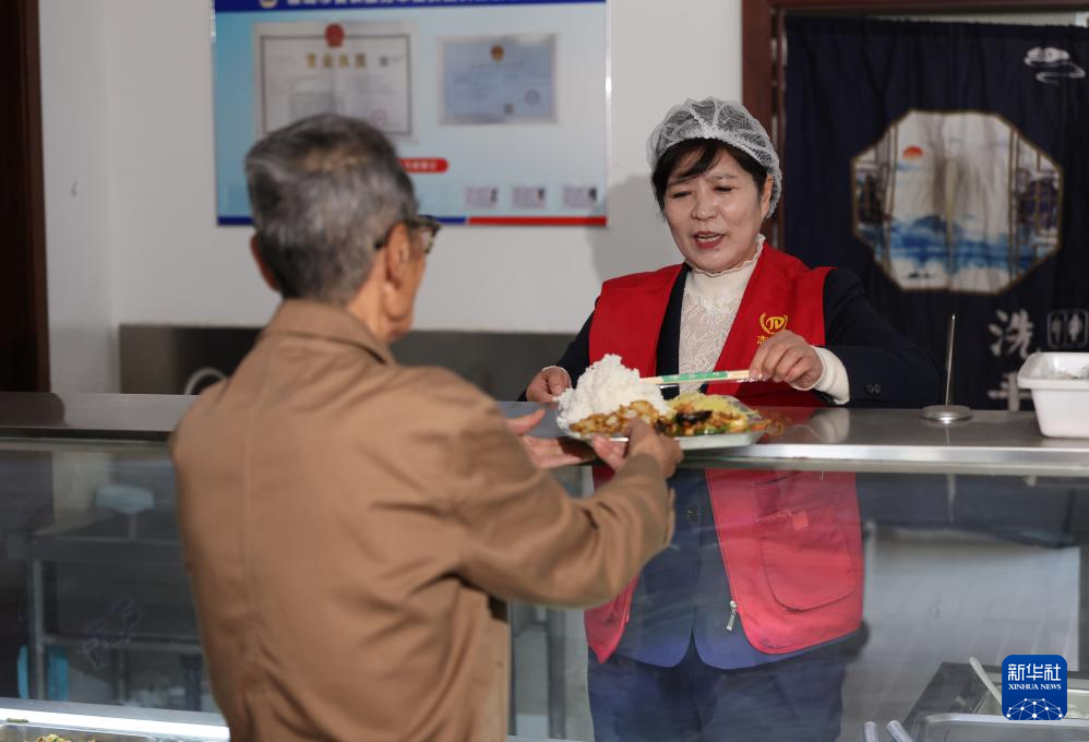 4月11日,马凤侠在福康社区“阳光食堂”给老人打饭。