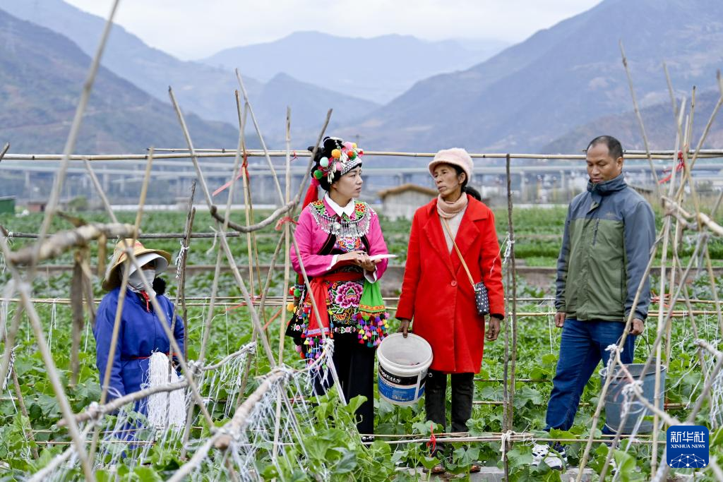 3月19日,鲁丽华(左二)在南涧彝族自治县南涧镇杨免庄村蔬菜种植田间给群众讲解惠农、强农、富农政策。