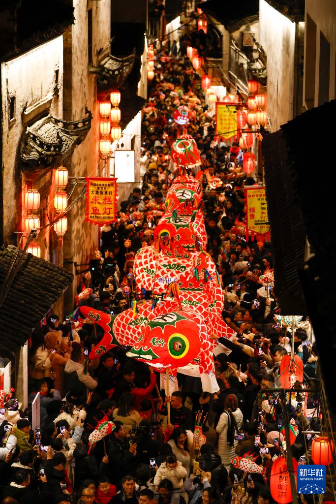 2024年12月31日,在安徽省黄山市歙县北岸镇瞻淇村,村民舞动非遗鱼灯,吸引了众多游客。