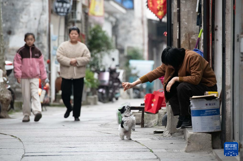 3月23日,在安徽省黄山市歙县徽州古城内,当地居民与小狗互动。
