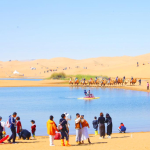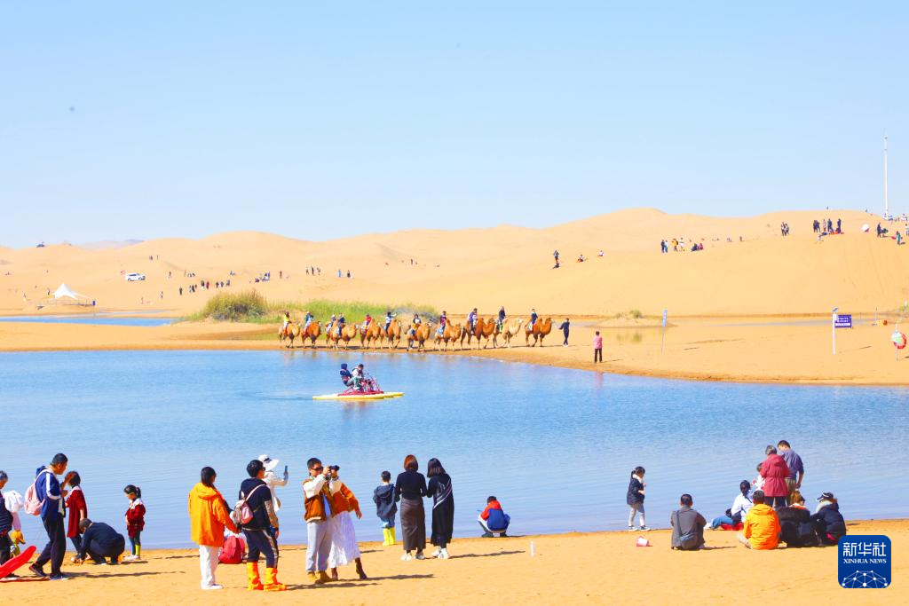 如今,每年都有大量游客来体验难得一见的沙漠风光。一入夏季,湖边沙上满是游客。他们骑着骆驼、驾着车,拍着短视频,享受诗与远方。