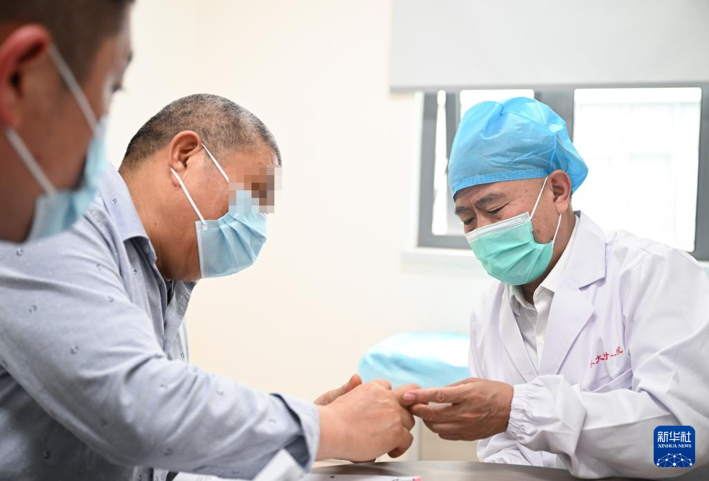 4月22日,在苏州大学附属第一医院,吴德沛为门诊患者检查肿胀的手指。
