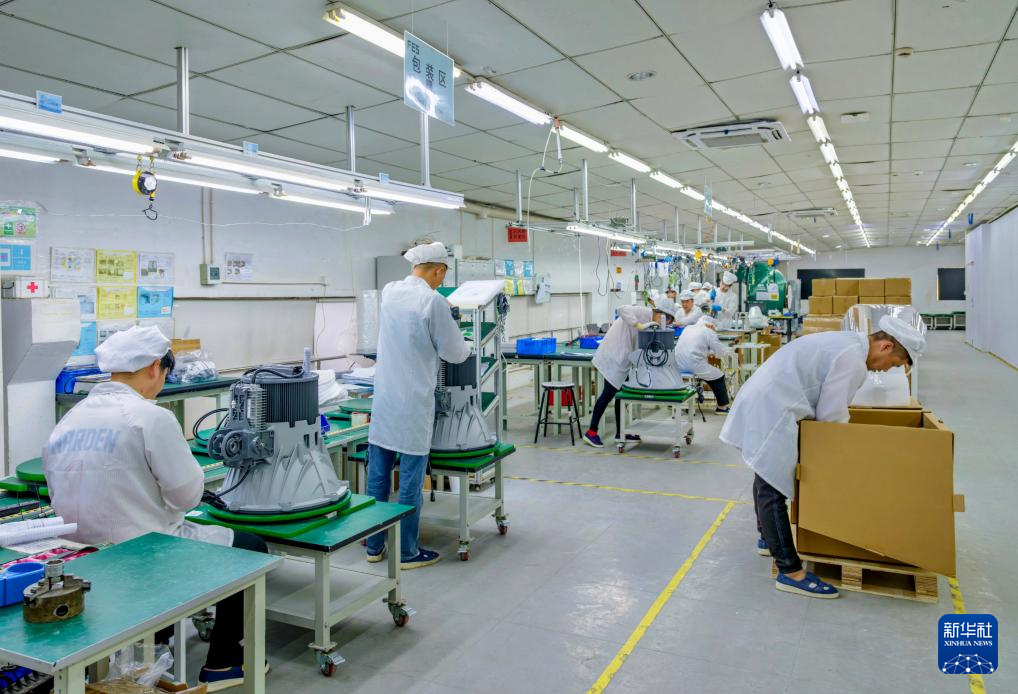工作人员在上海赛倍明照明科技有限公司的生产车间组装定制的赛事和娱乐一体式灯具(5月8日摄)。