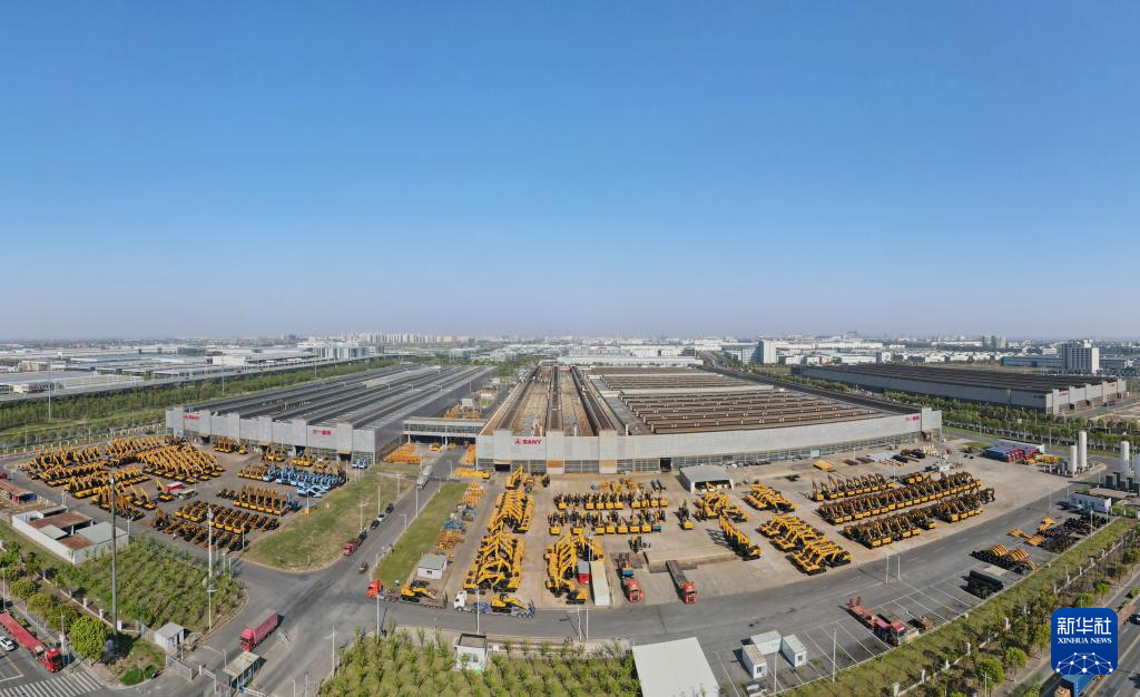 这是上海三一重机股份有限公司内等待装运的挖掘机产品。蓝色车型为出口海外的纯电挖掘机产品(4月15日摄)。