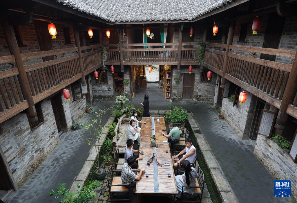 游客在龙南市杨村镇的细翼围内品茶交谈(6月19日摄)。