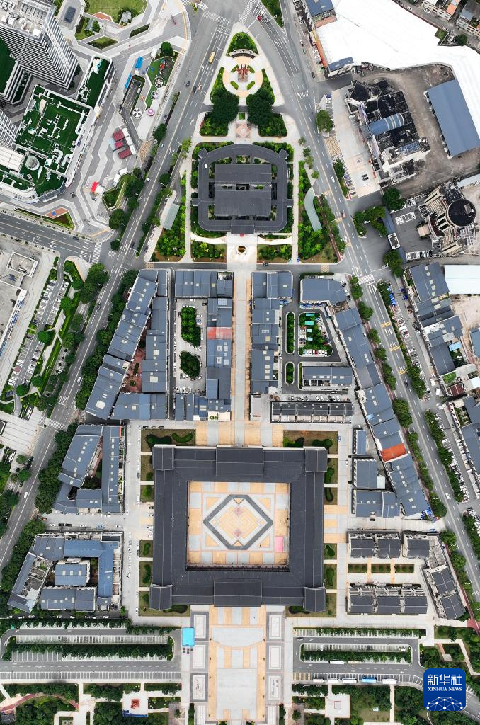 这是融入客家围屋建筑风格的龙南市世界客家民俗文化城(6月19日摄,无人机照片)。