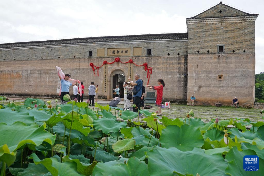 游客在龙南市杨村镇燕翼围周边游览(6月19日摄)。
