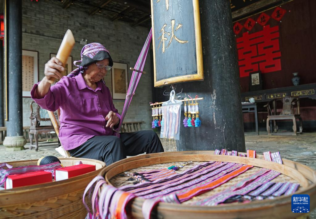 村民在位于龙南市关西镇的关西新围编制客家织带(6月19日摄)。