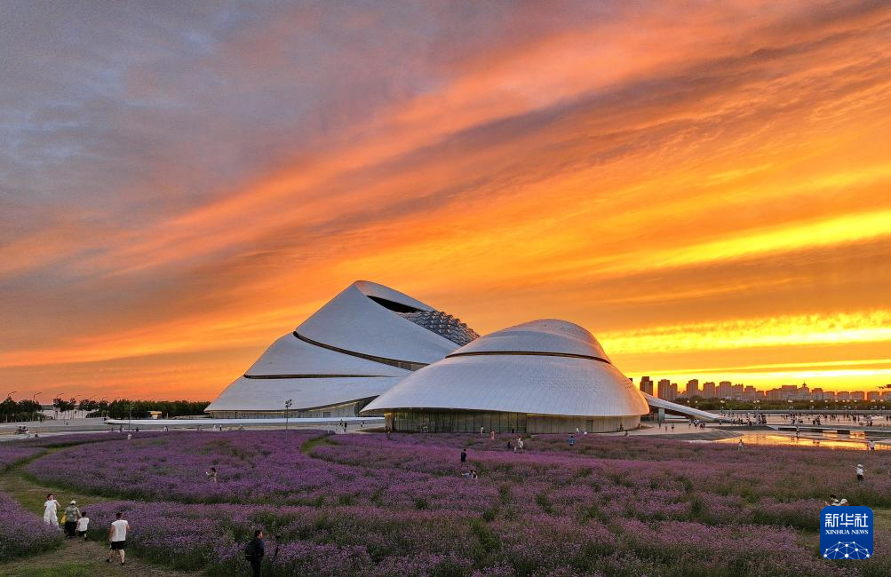 7月20日,在哈尔滨大剧院附近,人们在绚烂晚霞中游玩拍照(无人机照片)。