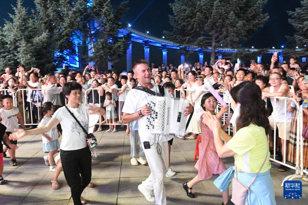 7月22日,在哈尔滨市防洪纪念塔广场,游客与来自俄罗斯的手风琴手互动。