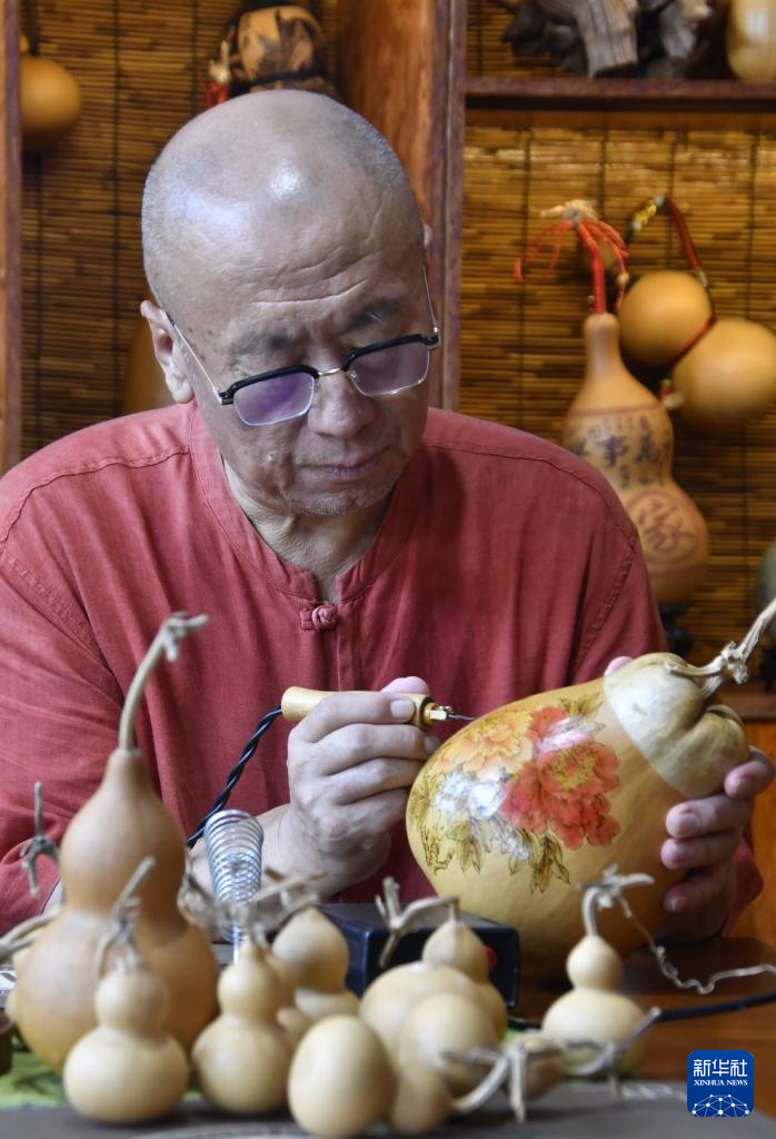 在怀柔区桥梓镇禧宝露文化中心,怀柔区非物质文化遗产焦家浸烙葫芦代表性传承人焦宇在烙制葫芦(8月6日摄)。